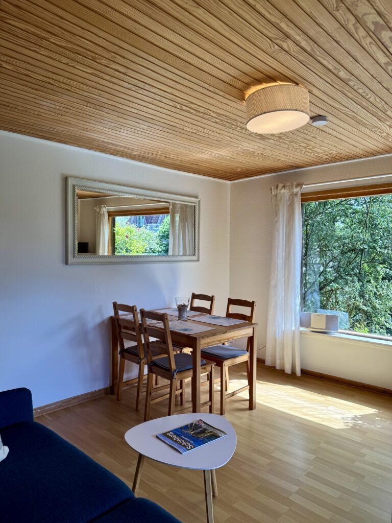 Die Küche ist mit einem 2 Plattenherd und Kühlschrank ausgestattet und bietet Ihnen die Möglichkeit, kleine Mahlzeiten zuzubereiten. Genießen Sie Ihre Mahlzeiten am Esstisch für vier Personen und lassen Sie sich von dem herrlichen Blick auf den Garten verzaubern.
